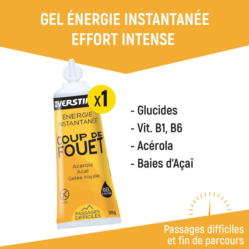 Pour les passages difficiles et fin de parcours, COUP DE FOUET le gel énergétique à énergie instantanée. » Véritable concentré d’énergie instantanée, le gel énergétique COUP DE FOUET est votre meilleur allié en cours d’épreuve lors d’efforts intenses (difficultés, ascensions …).