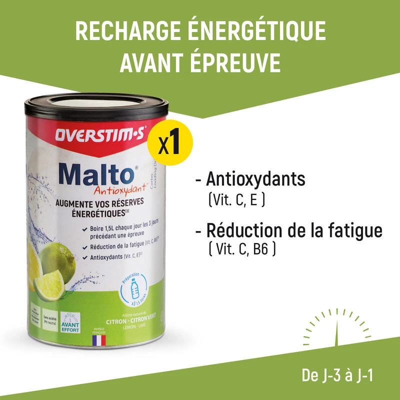 Faites le plein d’énergie les 3 jours précédant votre épreuve avec MALTO. Les 3 jours précédant l’épreuve, il est essentiel d’augmenter vos réserves énergétiques (glycogène musculaire) afin d’améliorer votre résistance et votre endurance à l’effort. La consommation de Malto antioxydant, composé à 94% de glucides lents, est un atout considérable à l’accroissement de vos réserves énergétiques sans avoir à s’alimenter copieusement. Durant les 3 jours précédant votre épreuve, buvez chaque jour
