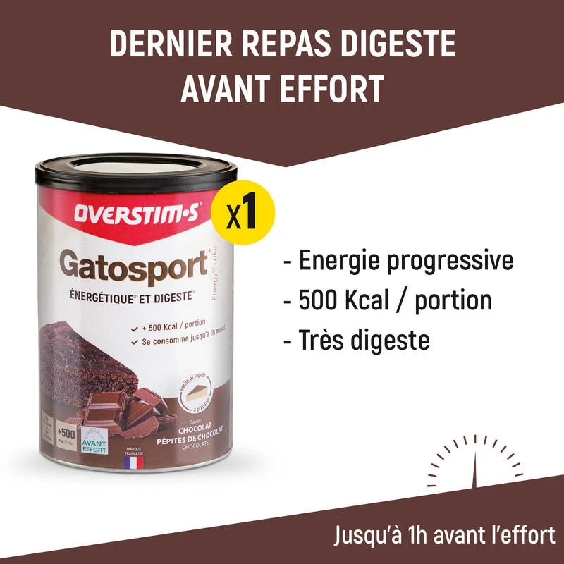 Jusqu’à 1 heure avant effort – Gatosport, votre petit-déjeuner d’avant course. Un petit-déjeuner « traditionnel » nécessite un temps de digestion important et entraîne bien souvent des perturbations digestives néfastes à l’activité sportive. Votre petit-déjeuner d’avant course doit être à la fois équilibré, énergétique et parfaitement digeste. Gatosport est la solution pour réunir les meilleures conditions de départ. Sa haute valeur nutritionnelle permet de répondre aux besoins énergétiques.